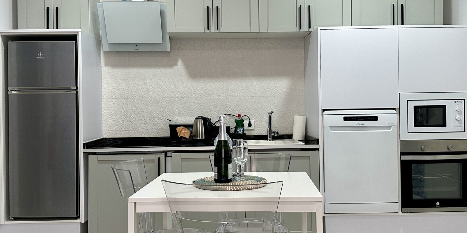 La cocina, funcional y totalmente equipada, incluye nevera, horno y lavavajillas, junto con otros electrodomésticos esenciales como microondas, fogones, tostadora y cafetera. El espacio está perfectamente diseñado para preparar desde comidas rápidas hasta cenas elaboradas, todo al alcance de su mano.